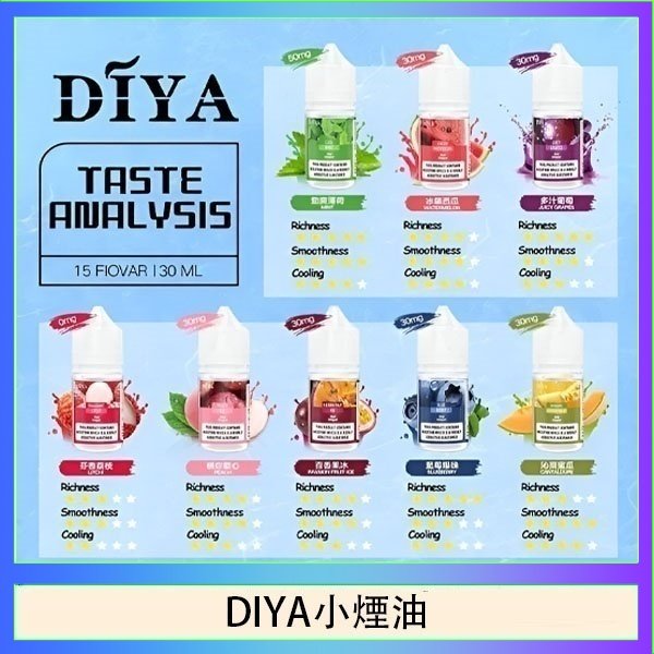 DIYA叮啞全新推出 15 種口味小煙油,0-50MG 尼古丁鹽濃度選擇,滿足不同需求。